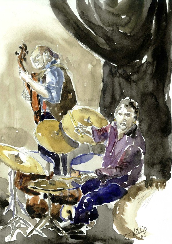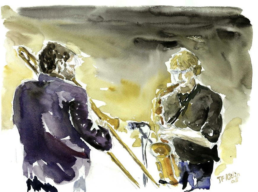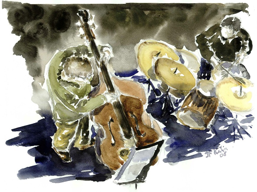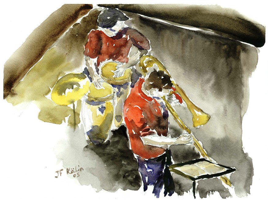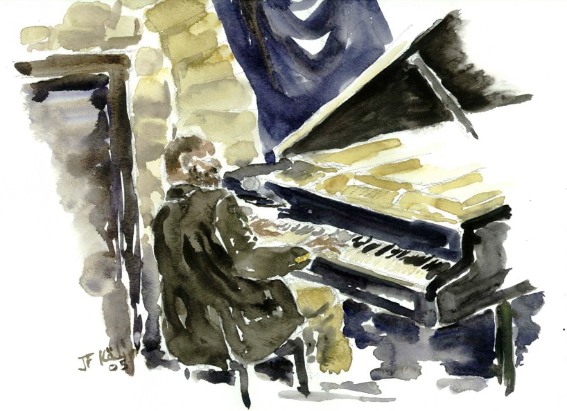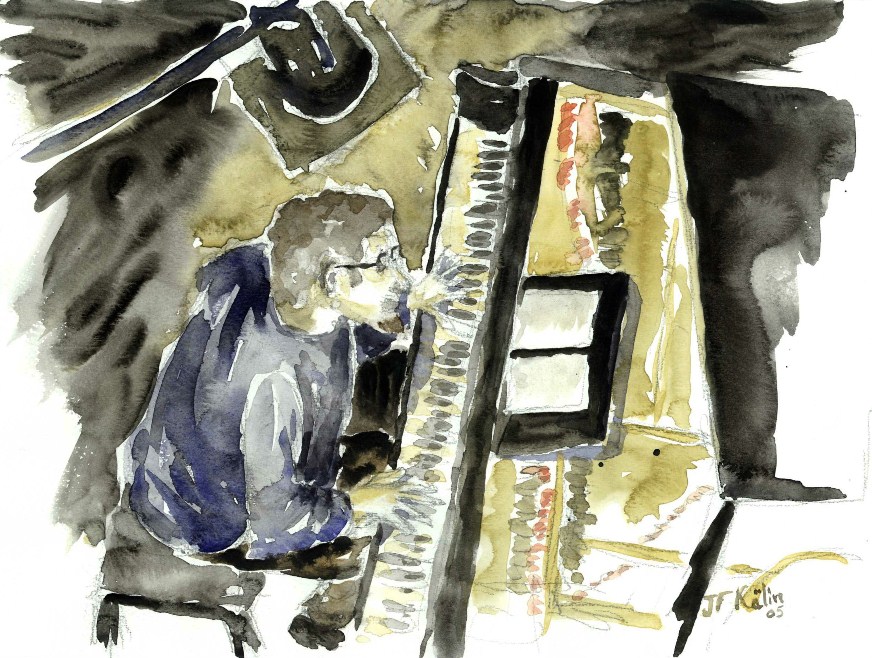 Tout simplement, évidemment, ça a commencé entre amis, autour d'une table … "Jean-François, tu viendrais illustrer l'Assemblée Générale de notre caveau-Jazz ?" Et moi de répondre "Ben … heu, oui ! Mais je ne sais pas ce que ça va donner, je ne l'ai jamais fait." Et me voilà dans l'ambiance du Pouf à Cully croquant les participants, le président et restant auprès du pianiste qui en clôture de l'assemblée venait jouer du Jazz, son Jazz. Et là, en observant le musicien, un sentiment étrange m'a totalement pris par surprise … cette impression bizarre d'être transpercé par la musique, de respirer dans le rythme, de partager son inspiration.