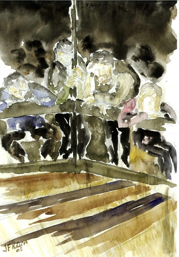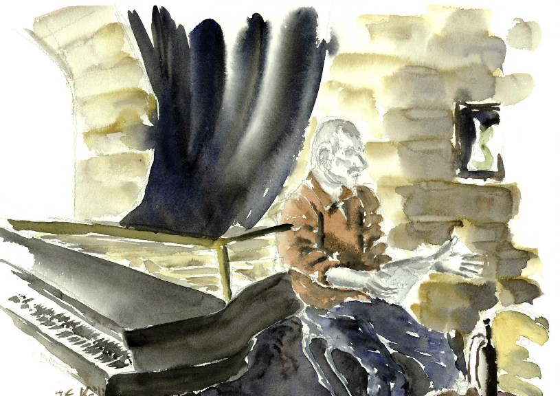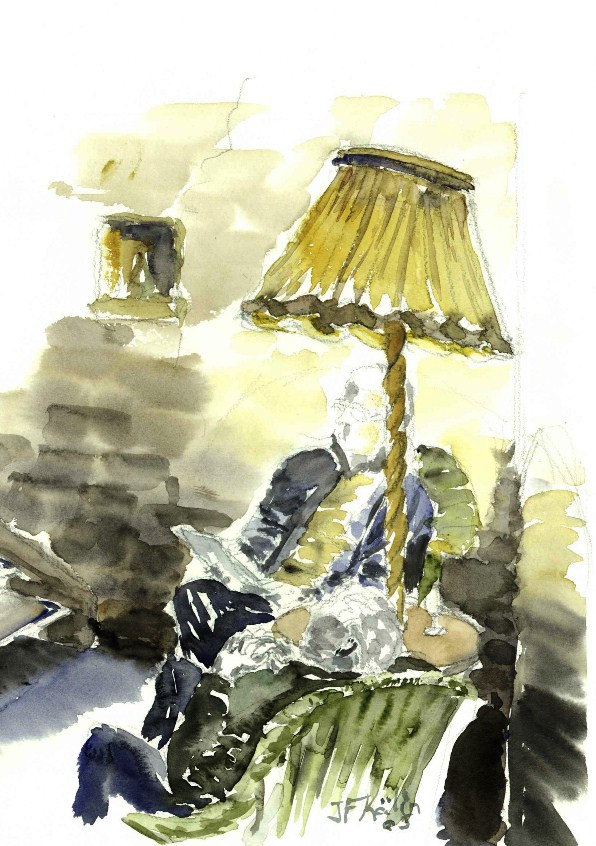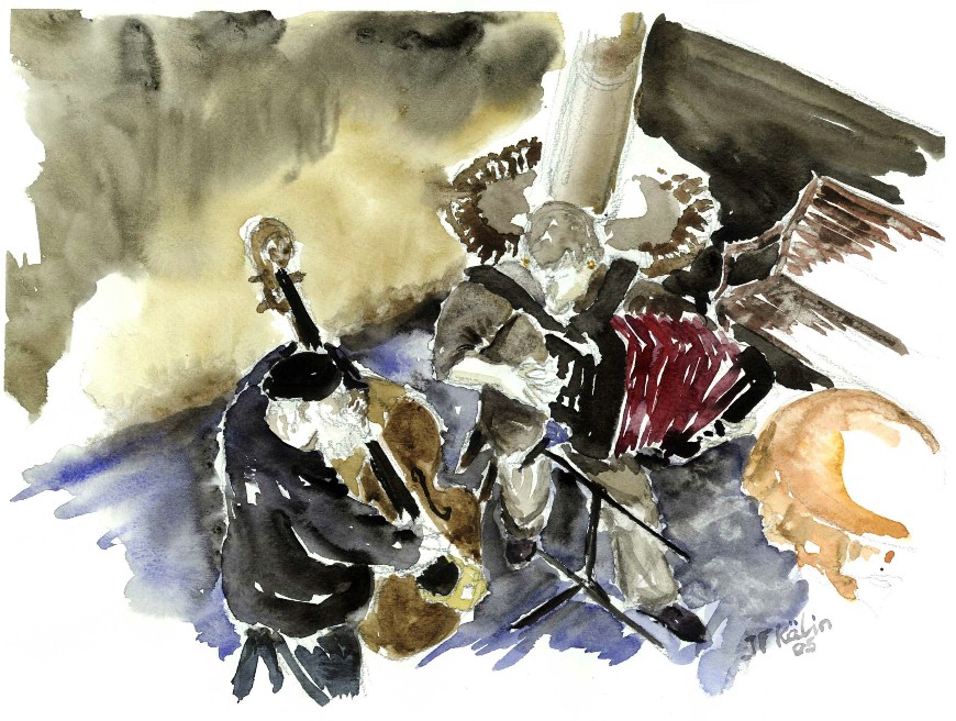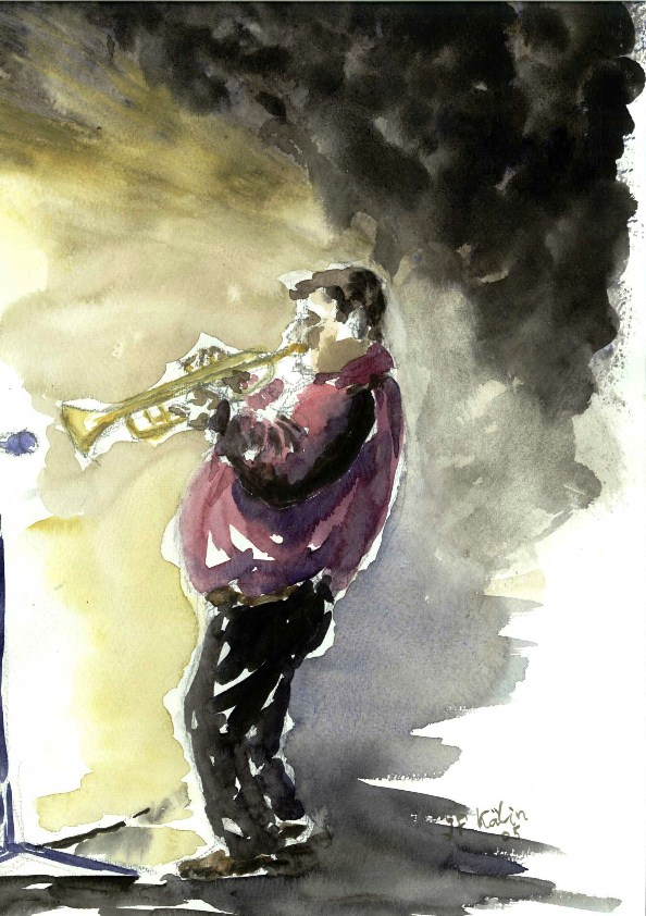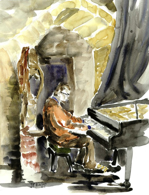 Tout simplement, évidemment, ça a commencé entre amis, autour d'une table … "Jean-François, tu viendrais illustrer l'Assemblée Générale de notre caveau-Jazz ?" Et moi de répondre "Ben … heu, oui ! Mais je ne sais pas ce que ça va donner, je ne l'ai jamais fait." Et me voilà dans l'ambiance du Pouf à Cully croquant les participants, le président et restant auprès du pianiste qui en clôture de l'assemblée venait jouer du Jazz, son Jazz. Et là, en observant le musicien, un sentiment étrange m'a totalement pris par surprise … cette impression bizarre d'être transpercé par la musique, de respirer dans le rythme, de partager son inspiration.
