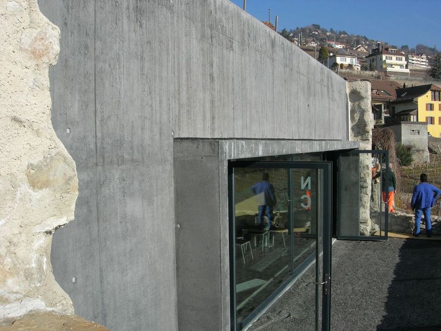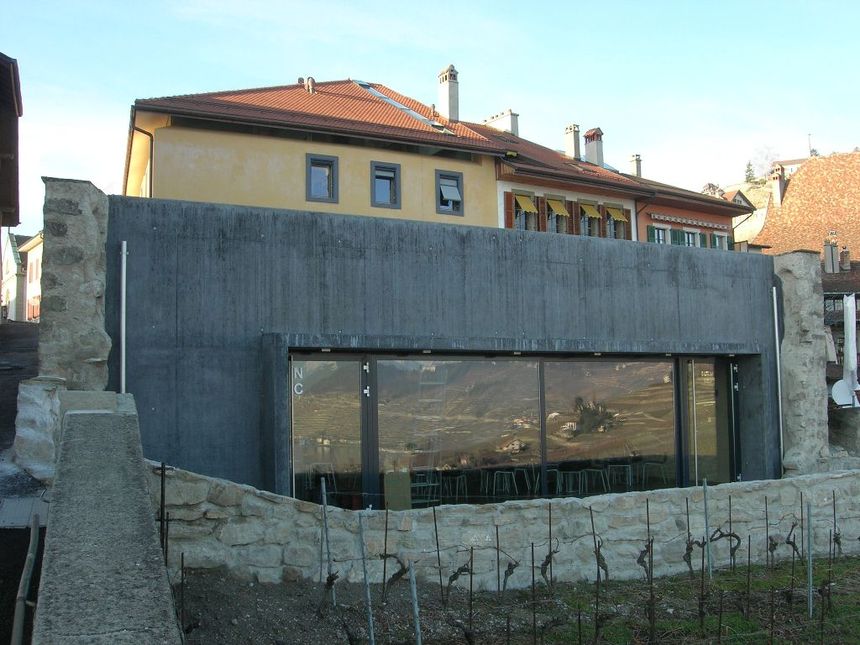 Création d'un caveau en conservant les murs de pierres existants. Façades en béton "noir" teinté dans la masse. Isolation phonique intégrée à la structure.