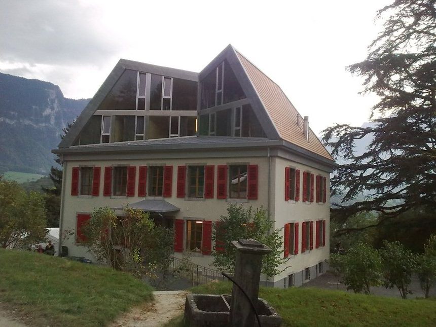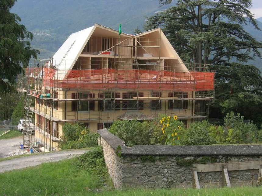 Remplacement de la toiture avec adjonction d'un étage supplémentaire. Transformations intérieurs pour réaffectation des volumes liés au programme des jeunes en difficulté. Structure bois en panneau massif contrecollé travaillant selon le principe d'une structure plissée. Note 2 au recensement architectural