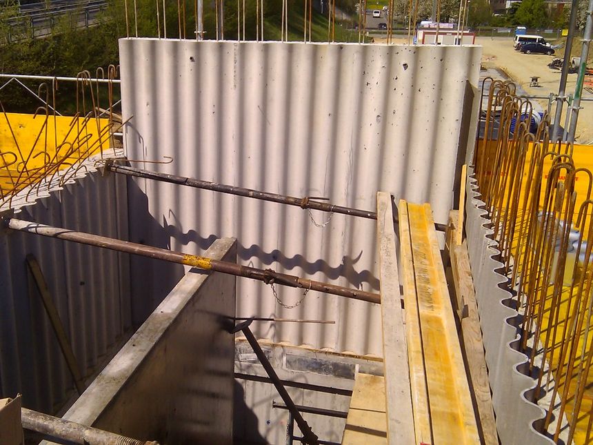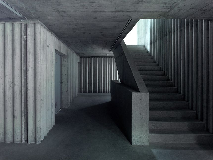 Murs en béton apparent, certains coffrages sont texturés "ondulés". Bâtiment de 3 étages, 2 dalles suspendues par des sommiers précontraints en toiture. Porte-à-faux sur la façade avant de 8 mètres.