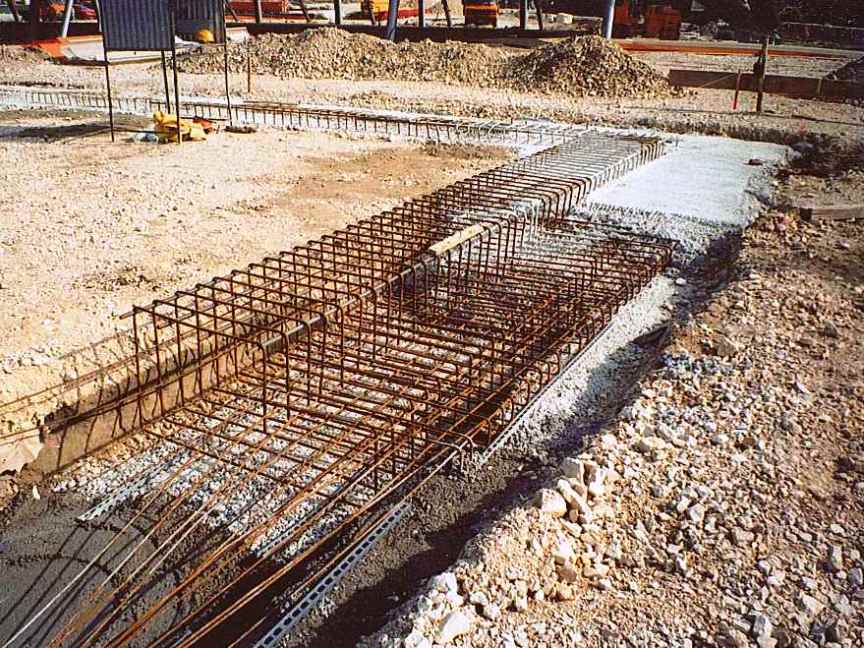 Radier en béton armé sur sol de très mauvaise portance. Structure métallique en grille de poutres. Angles de la structure libres et en porte-à-faux.