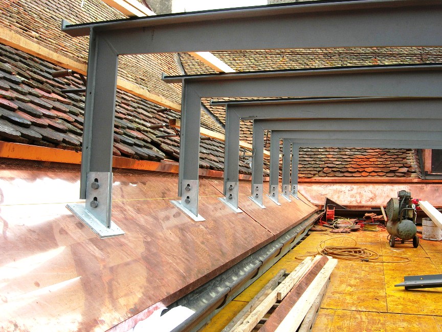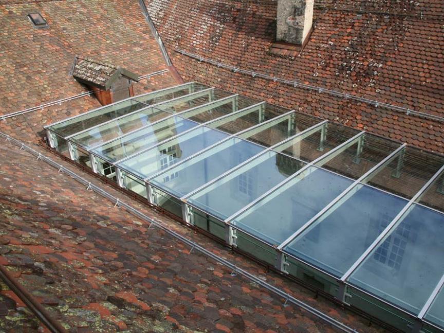 Création d'une verrière avec une structure métallique portant sur les avant-toits. Renforcement des charpentes pour recevoir le poids supplémentaire de la nouvelle verrière.