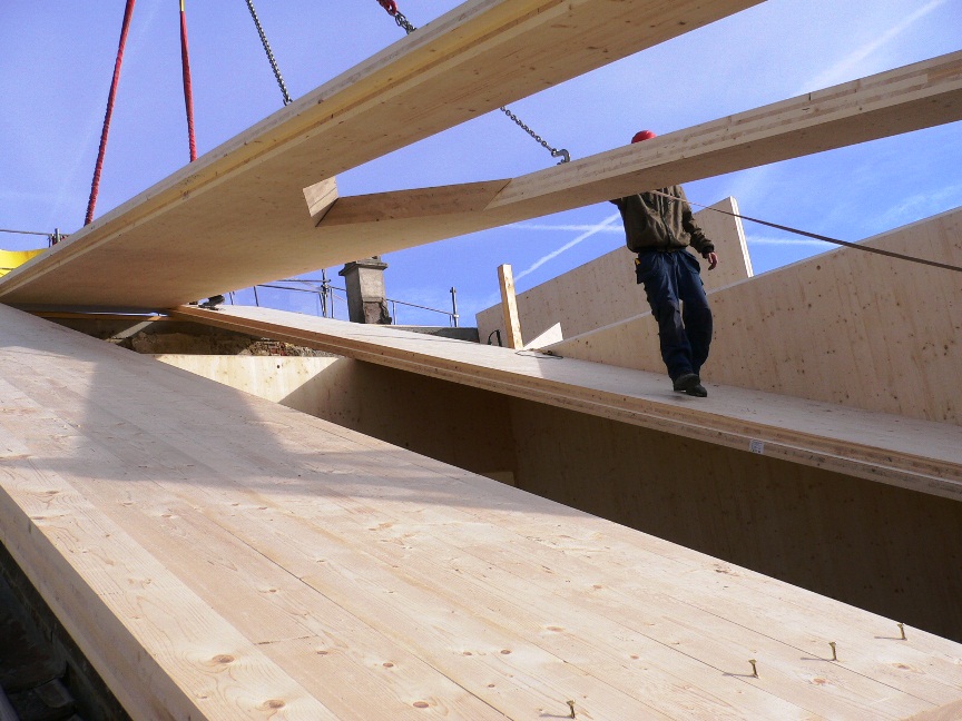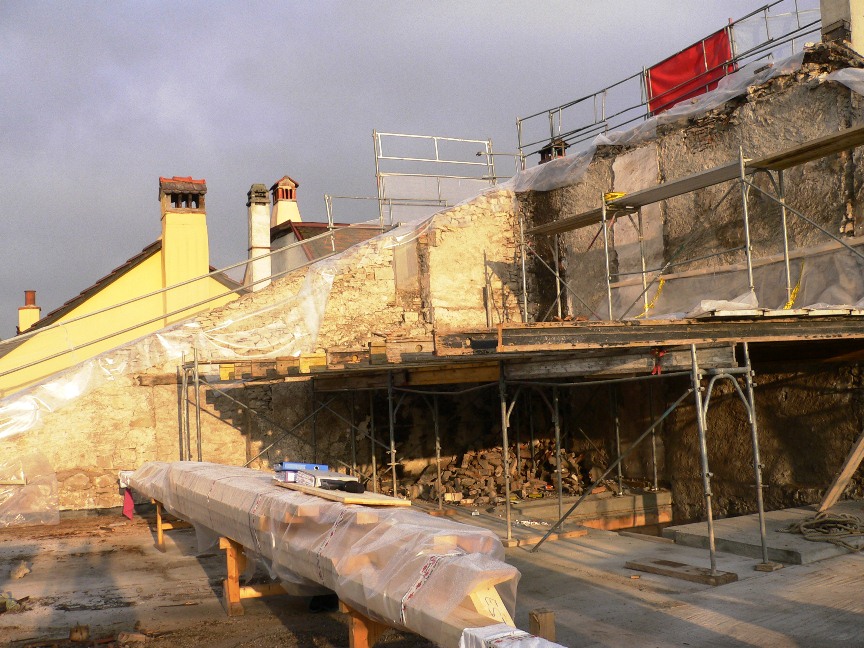 Transformation dans le cadre d'un village dont le périmètre du chantier s'exige des 4 murs du bâtiment existant. Renforcement des solives existantes avec un système mixte bois-béton. Remplacement de la charpente d'une géomètrie complexe avec un "chapeau" en bois massif contrecollé.