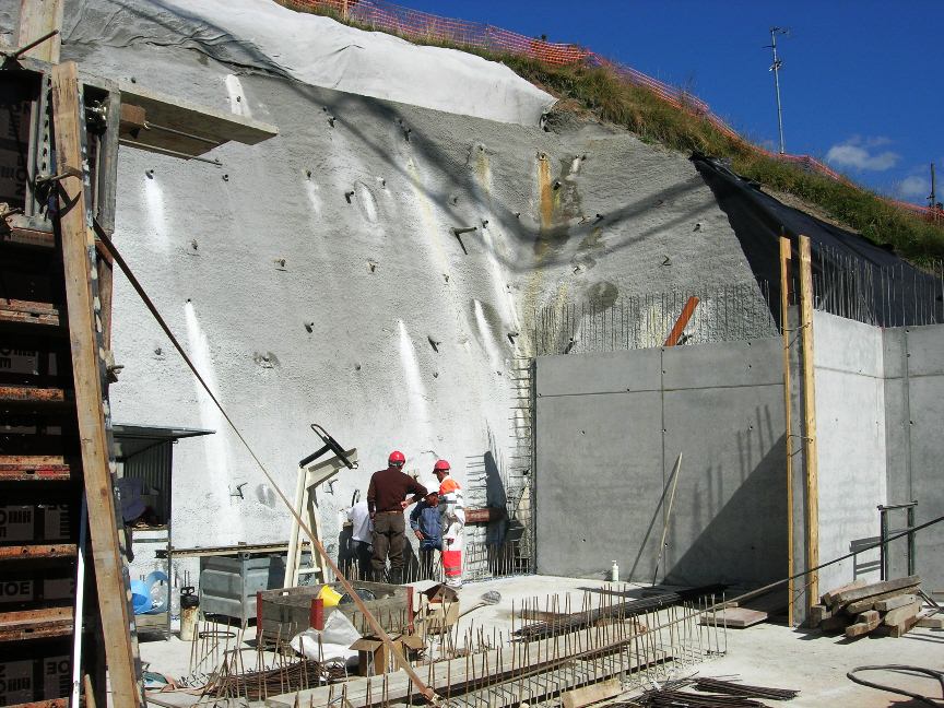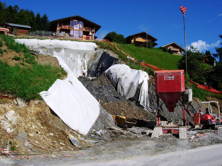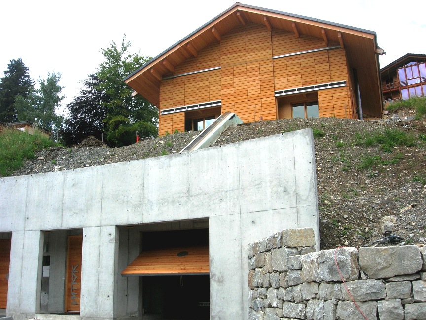 Terrassement dans un terrain en pente, parois clouées, sous-sol en béton, construction en caisson bois.