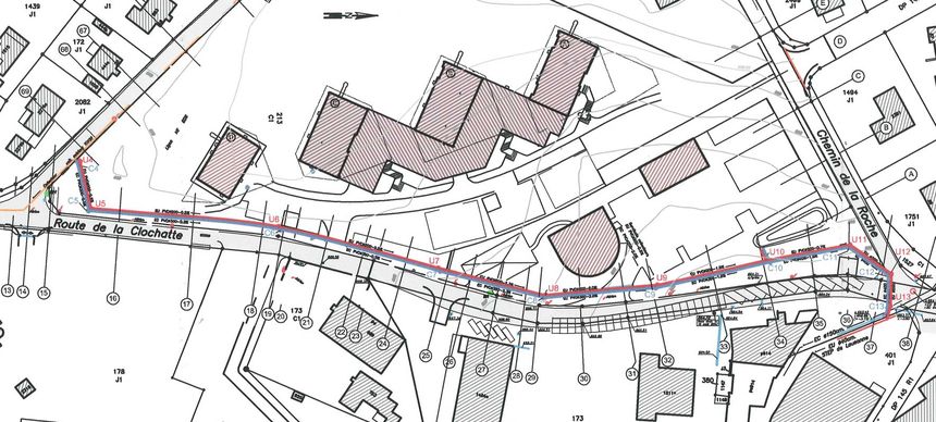 Collecteur séparatif en bordure de la route de la Clochatte entre le chemin de la Roche et la route de Sauvabelin sur une longueur de 350m. Profondeur de 1.70m à 3.50m, 14 chambres de visites.