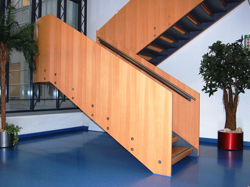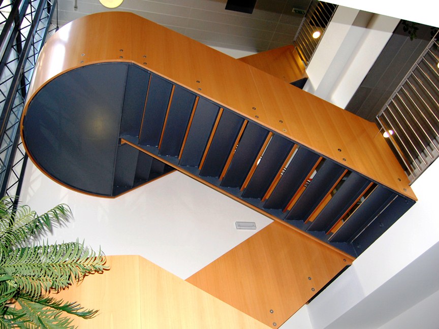 Escalier demi tournant portant de palier à palier. Structure en acier et garde en bouleau