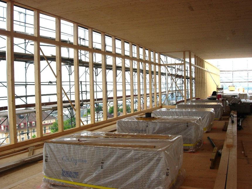 Surélévation de la néonatologie, construction légère, structure en bois préfabriquée, appuis et colonnes en acier. Noyau central en béton armé, planchers en caisson bois préfabriqués pour report des charges sur les porteurs existants. Prolongation des ascenseurs.