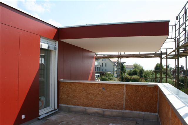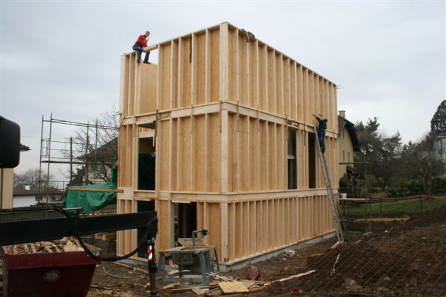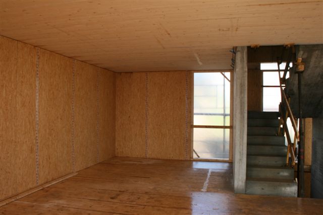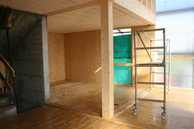 Villa avec piscine intérieure. Noyau centrale en béton avec une ossature en caissons bois préfabriqués. Porte-à-faux important en toiture.