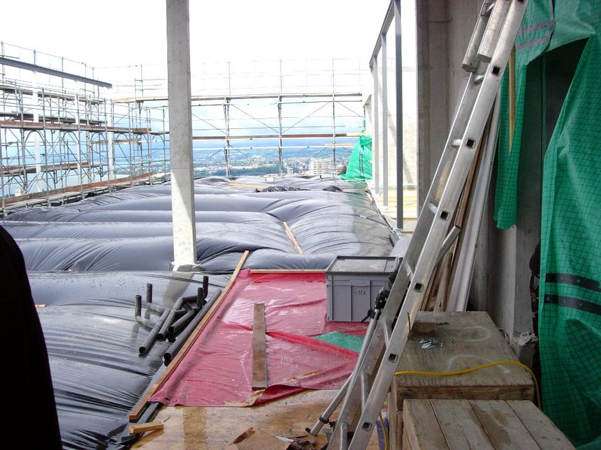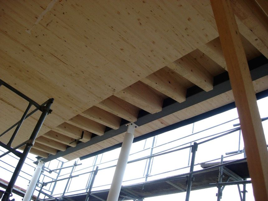 Surélévation de la néonatologie, construction légère, structure en bois préfabriquée, appuis et colonnes en acier. Noyau central en béton armé, planchers en caisson bois préfabriqués pour report des charges sur les porteurs existants. Prolongation des ascenseurs.